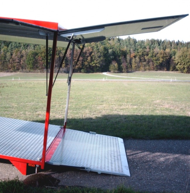 Der Fahrzeugboden ist mit Alu-Riffelblech belegt, dies garantiert eine lange Haltbarkeit. Die Auffahrrampen sind abnehmbar, um den Anhänger auch als Plattform nutzen zu können.