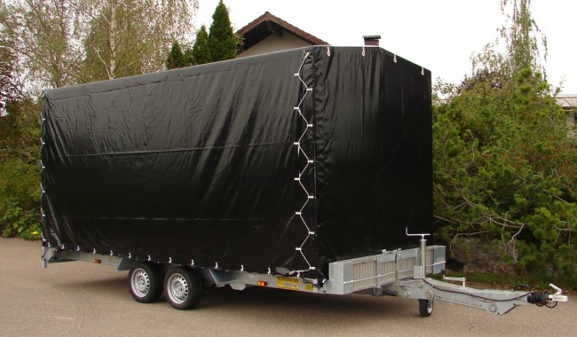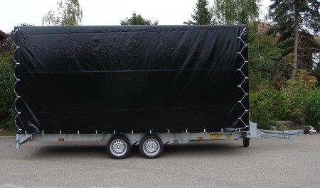 Ihren Anhänger erhalten Sie natürlich auch als Planenfahrzeug, natürlich auch mit einer Planenspitze. Die zum Autotransport benötigten Auffahrschienen werden im Rahmen unten eingeschoben. Eine elektrische Seilwinde und zwei Ersatzräder wurden stirnseitig in der Spitze verstaut.