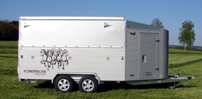 Auch die Planenfahzeuge erhalten Sie bei uns z.B. mit großer begehbarer Sattelkammer mit vergrößerter Einstiegstüre, Rundung oder auch einer Markise. Die Servicetüre zwischen dem Pferdebereich und der Sattelkammer ist natürlich auch Standard.