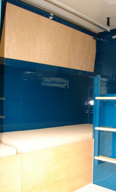 Das obere Bett ist nach hinten abklappbar. Dadurch entsteht ein Sitzbereich unten. Der Raum unter dem Bett unten wird zum Verstauen vom Ersatzrad, der Batterie, Weidezaunpfosten,... genutzt.